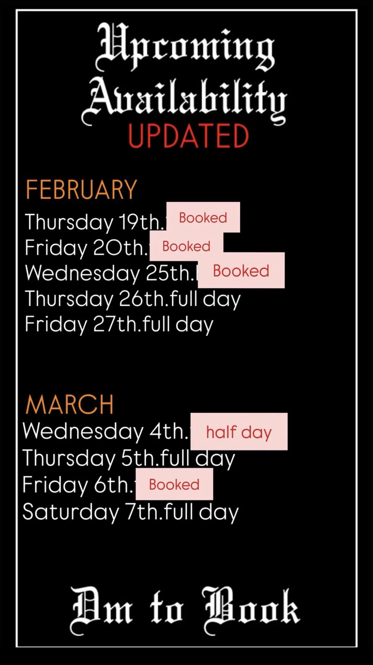 Zach is booking out fast for the months of February & March! Don’t miss out, book in now through the contact page!